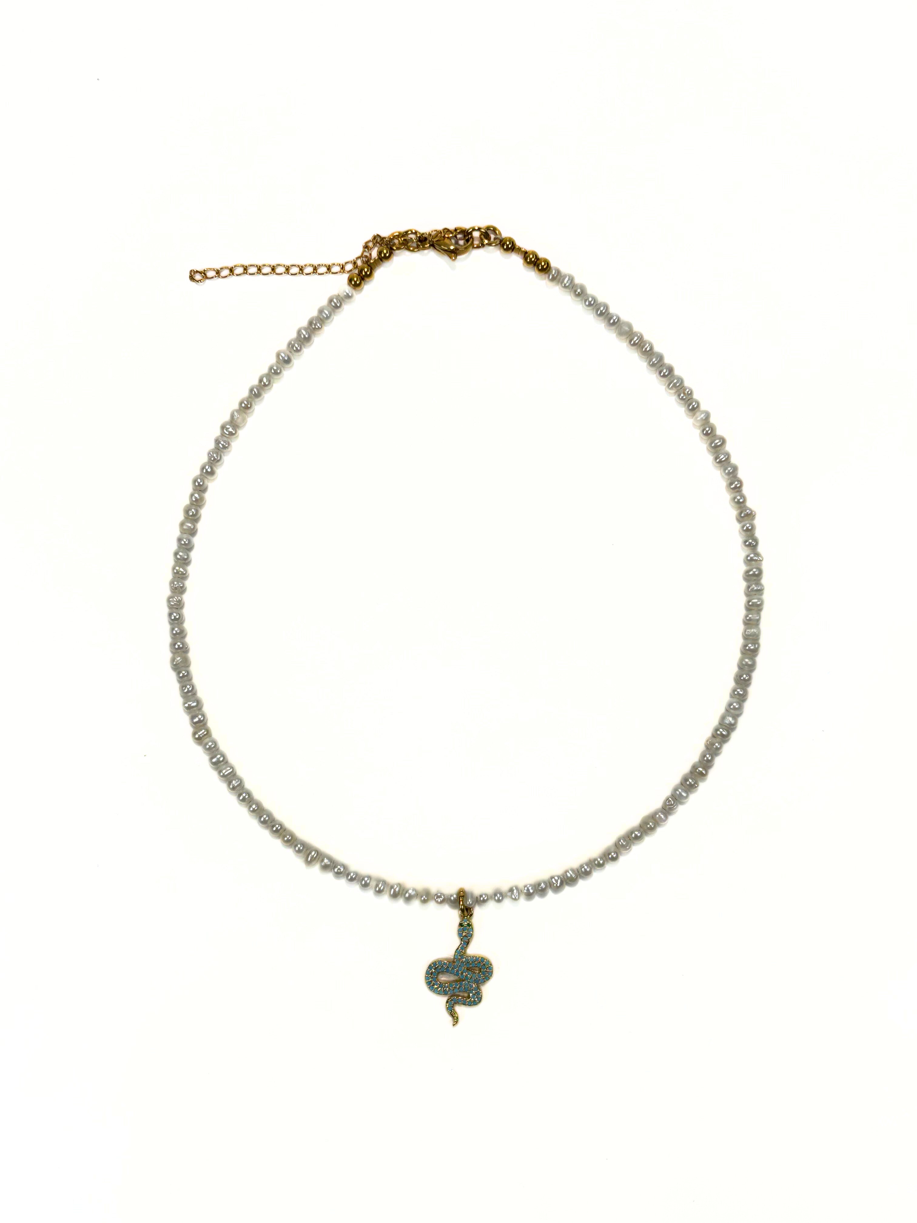 Precio regular $ 1,080.00Precio en oferta $ 1,080.00 Precio regularPrecio unitario / porUn collar delicado de mini perlas naturales con un dije de serpiente en microcristales turquesa. Elegante, místico y con un toque de poder femenino.Perfecto para quienes...
