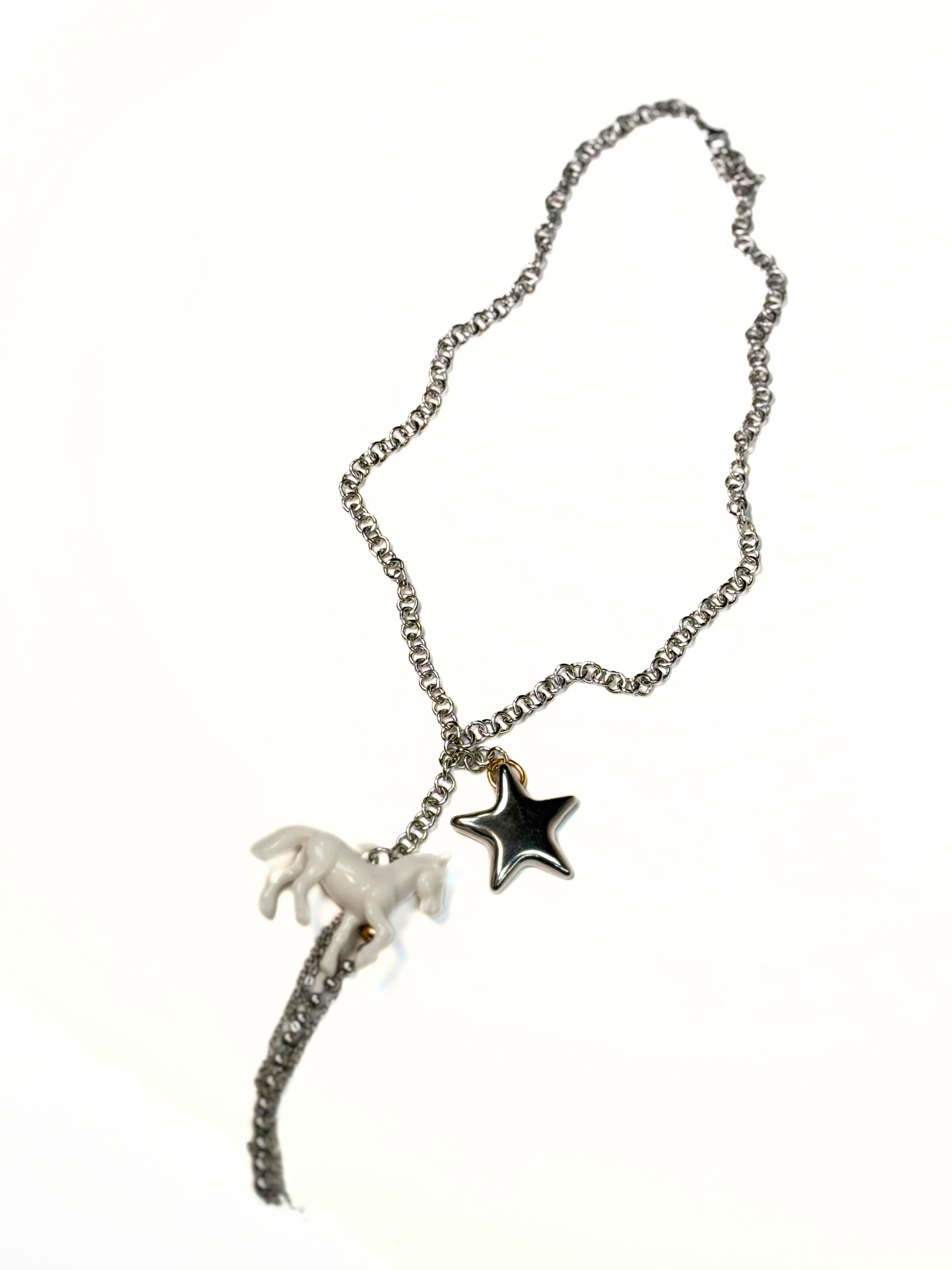 Precio regular $ 670.00Precio en oferta $ 670.00 Precio regularPrecio unitario / porEl Collar Horse Star es una joya mágica que combina fantasía y estilo contemporáneo. Su cadena plateada sostiene dos dijes encantadores: un caballo blanco con acabado...