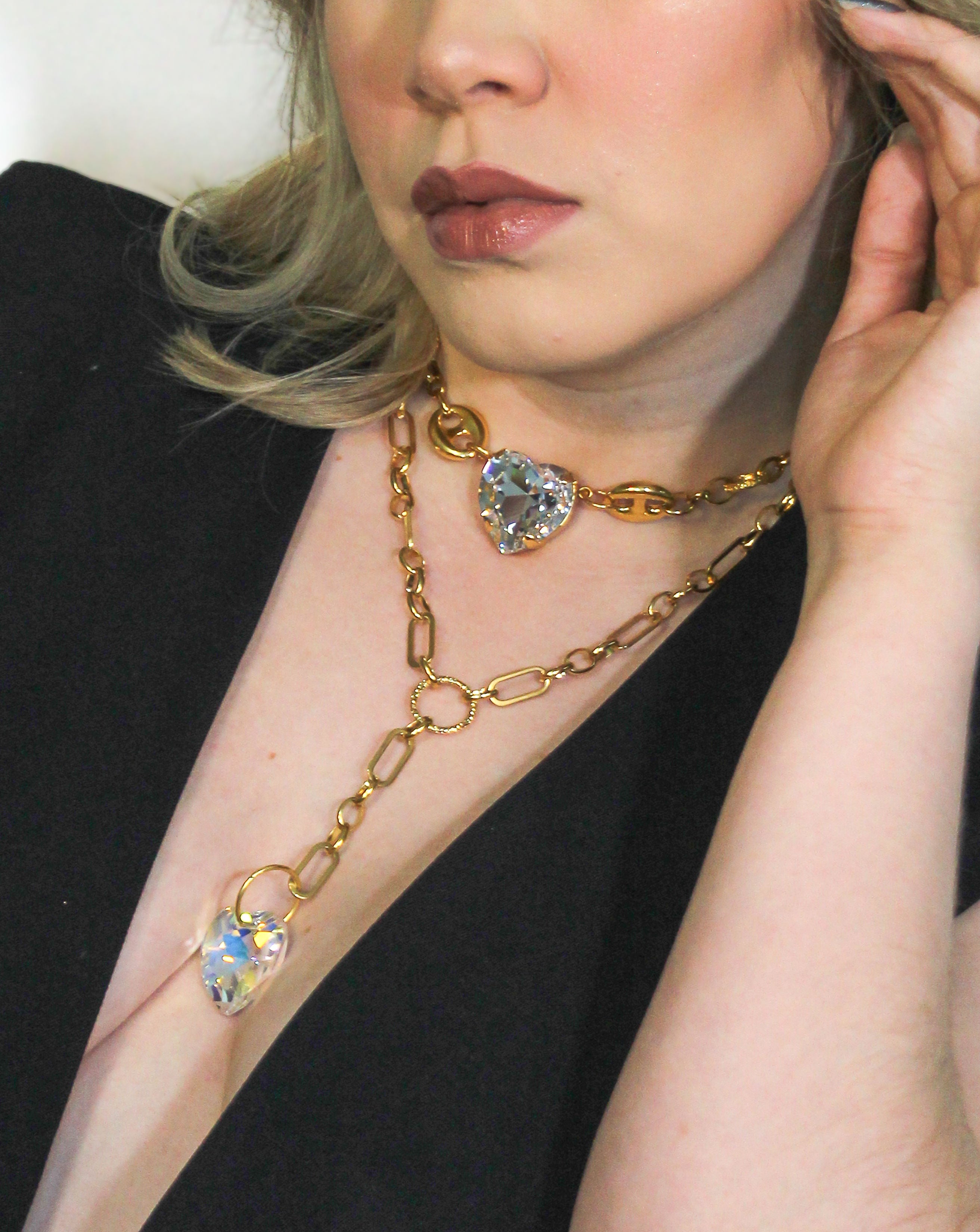En el centro, un cristal austriaco facetado aporta un destello sofisticado, mientras que los charms y las cadenas colgantes añaden movimiento y carácter a la pieza. La cadena plateada bordada a mano se convierte en un detalle único que aporta textura artesanal y un toque distintivo.
