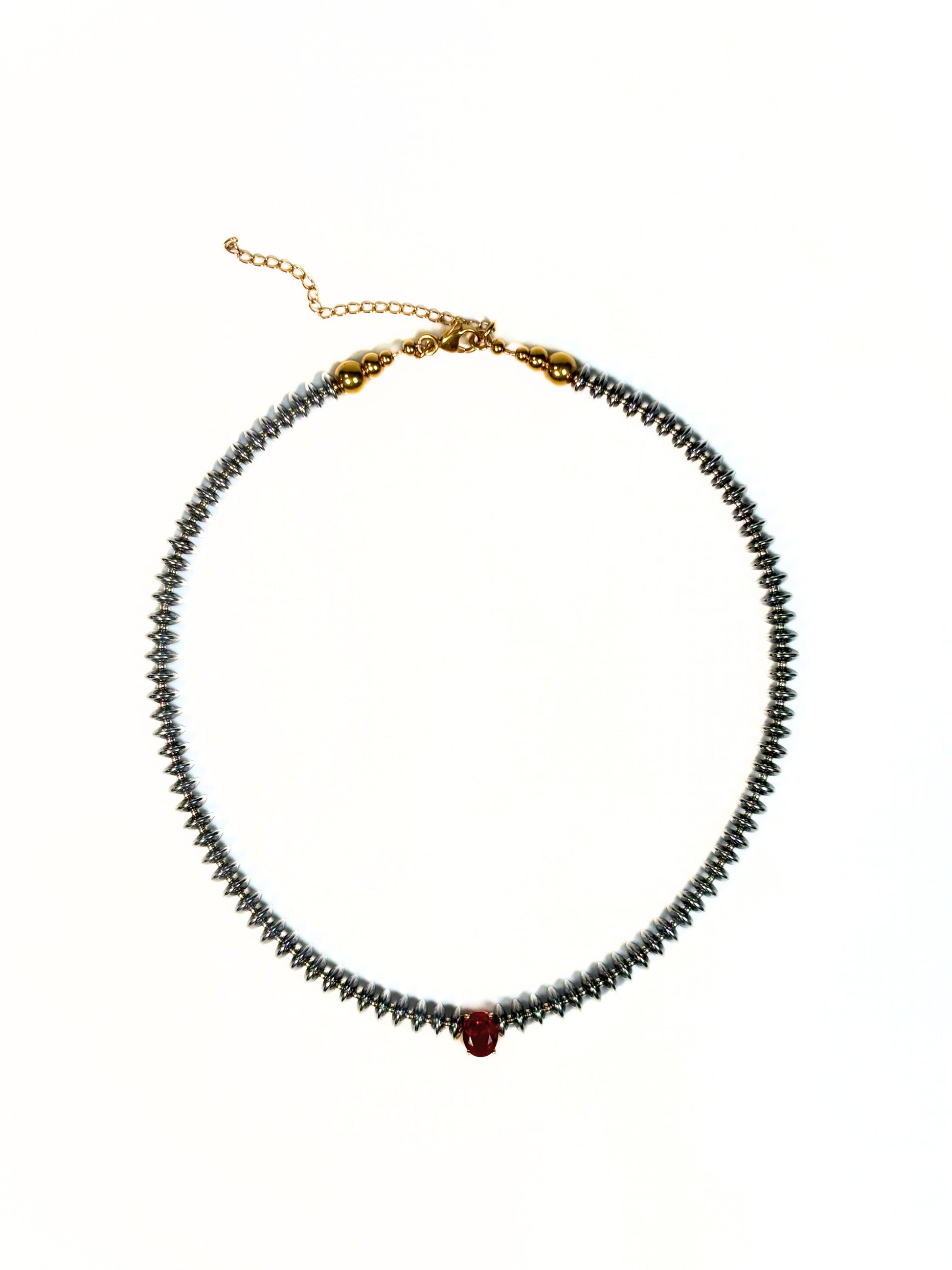 Piedra central facetada (roja o lila) que simboliza energía y equilibrio.
