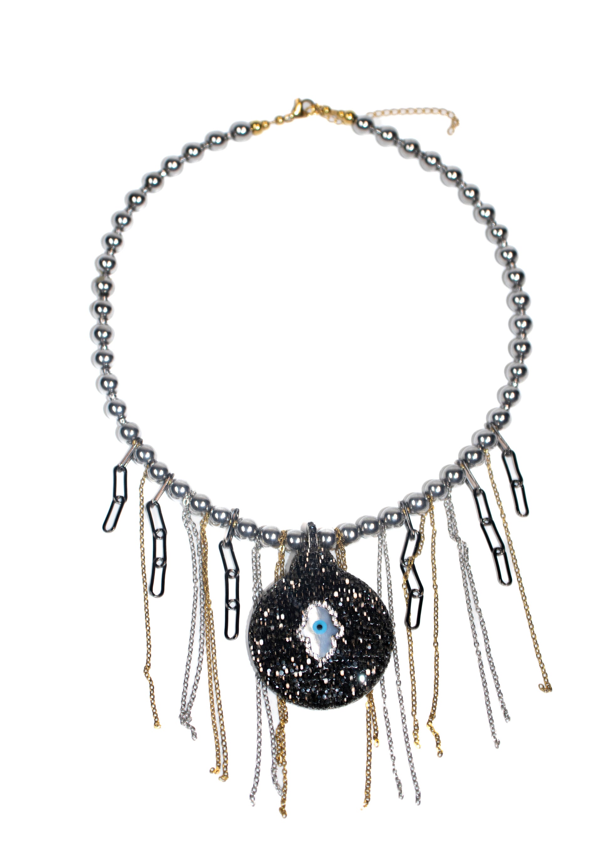 El collar Fátima está elaborado con cuentas de hematita metálica, piedra conocida por su capacidad de bloquear energías negativas y fortalecer la seguridad interior. En su diseño destacan detalles en cadenas doradas y plateadas, que aportan movimiento y brillo, evocando equilibrio entre la luz y la oscuridad.