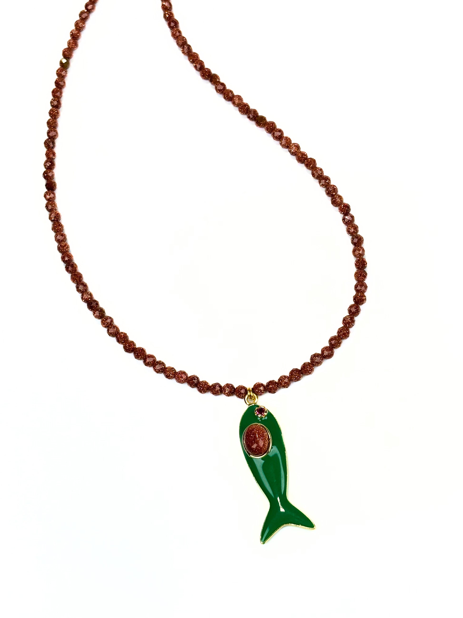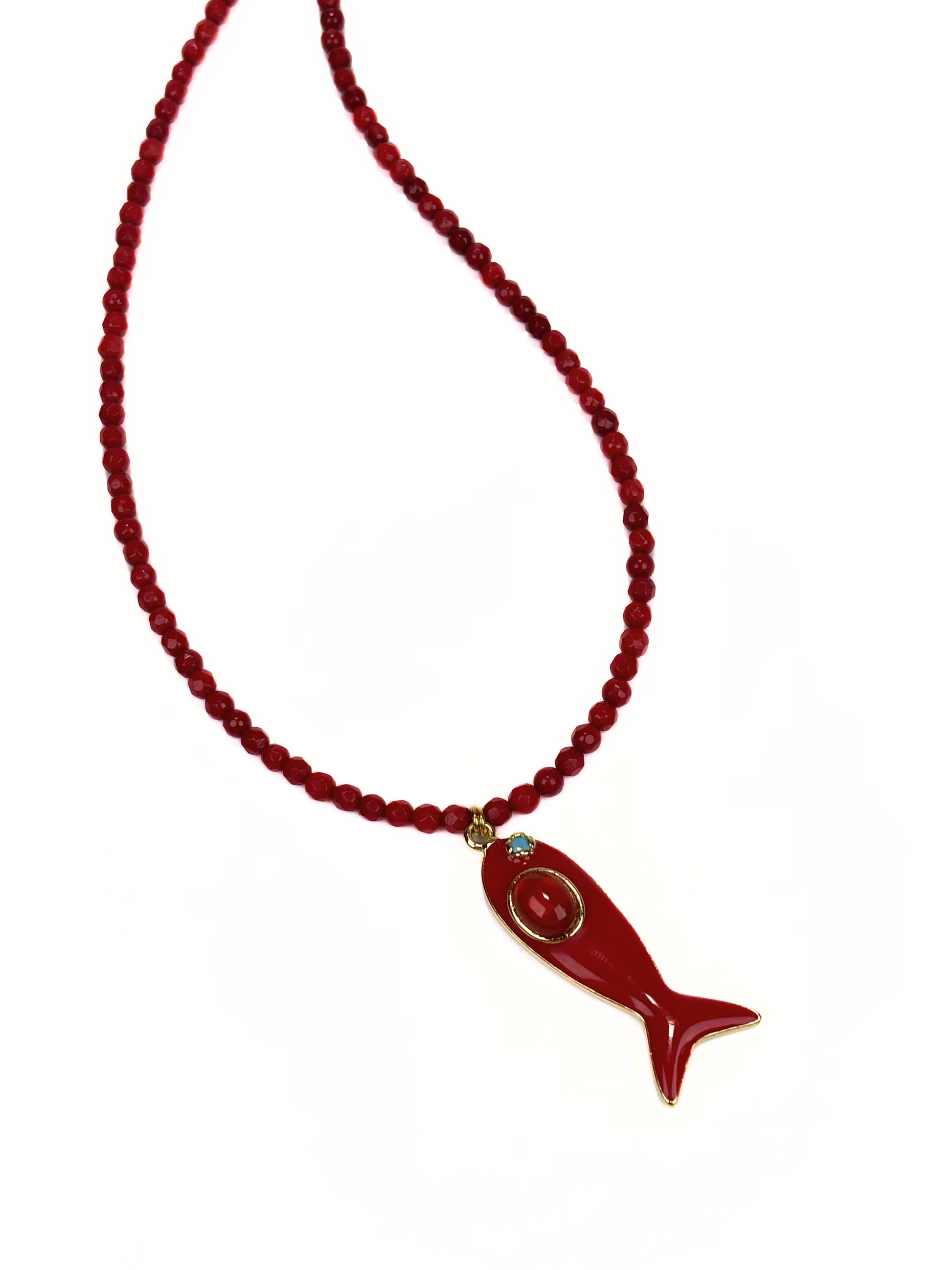 El collar Gemma está elaborado con cuentas facetadas finas que reflejan la luz con sutileza, y un dije esmaltado en forma de pez, símbolo de libertad, abundancia y fluidez. Su estilo alargado y su caída natural lo hacen ideal para usar solo o en capas.