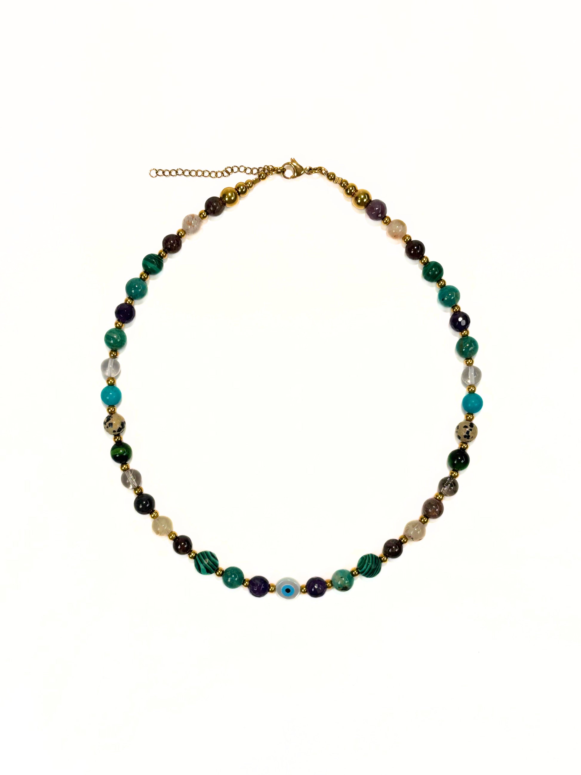 El Mystic Mix combina piedras naturales en tonos verdes, morados y neutros, creando una pieza armoniosa y única. Incluye un detalle de ojo turco al centro para protección y buena vibra.