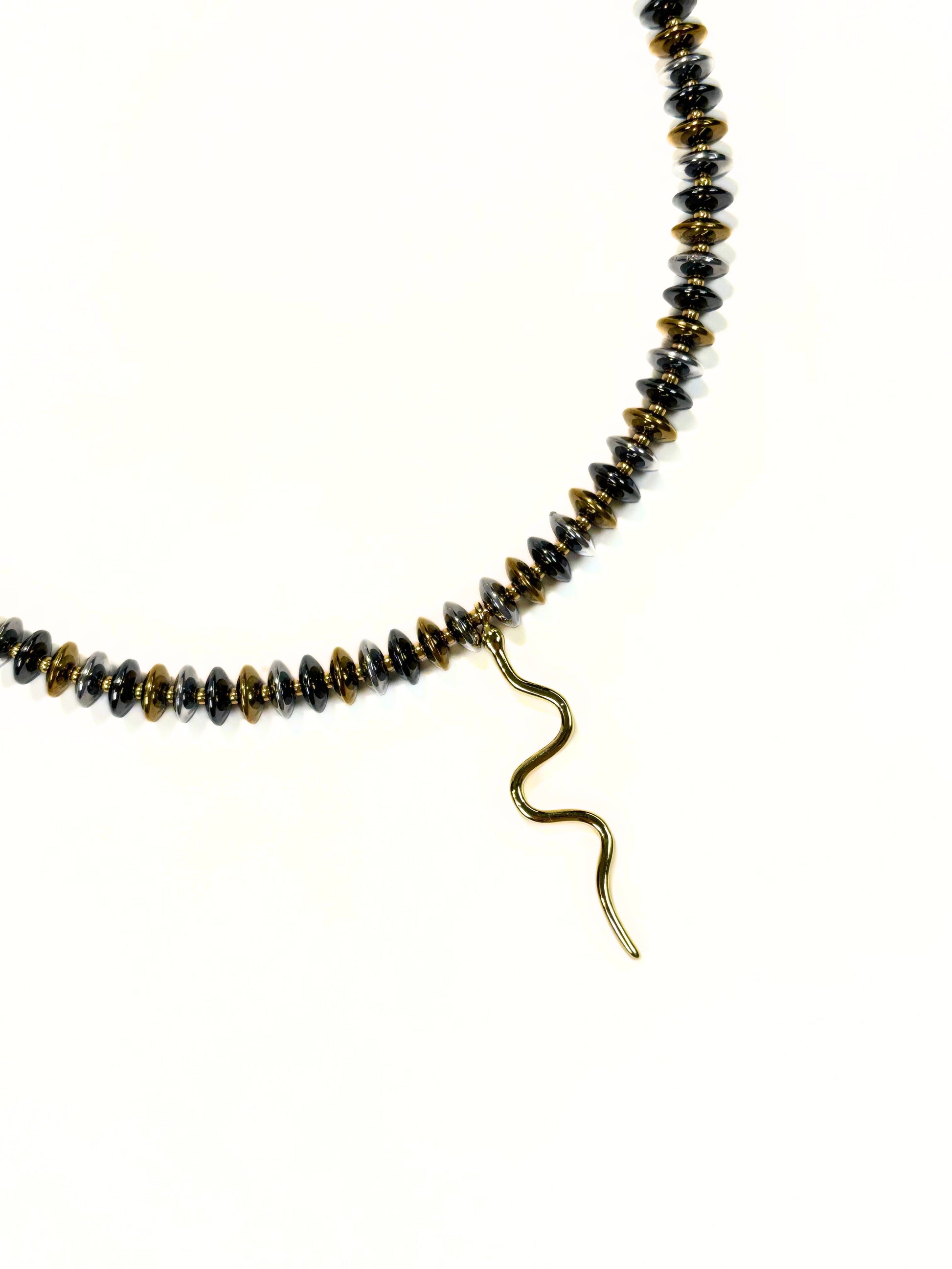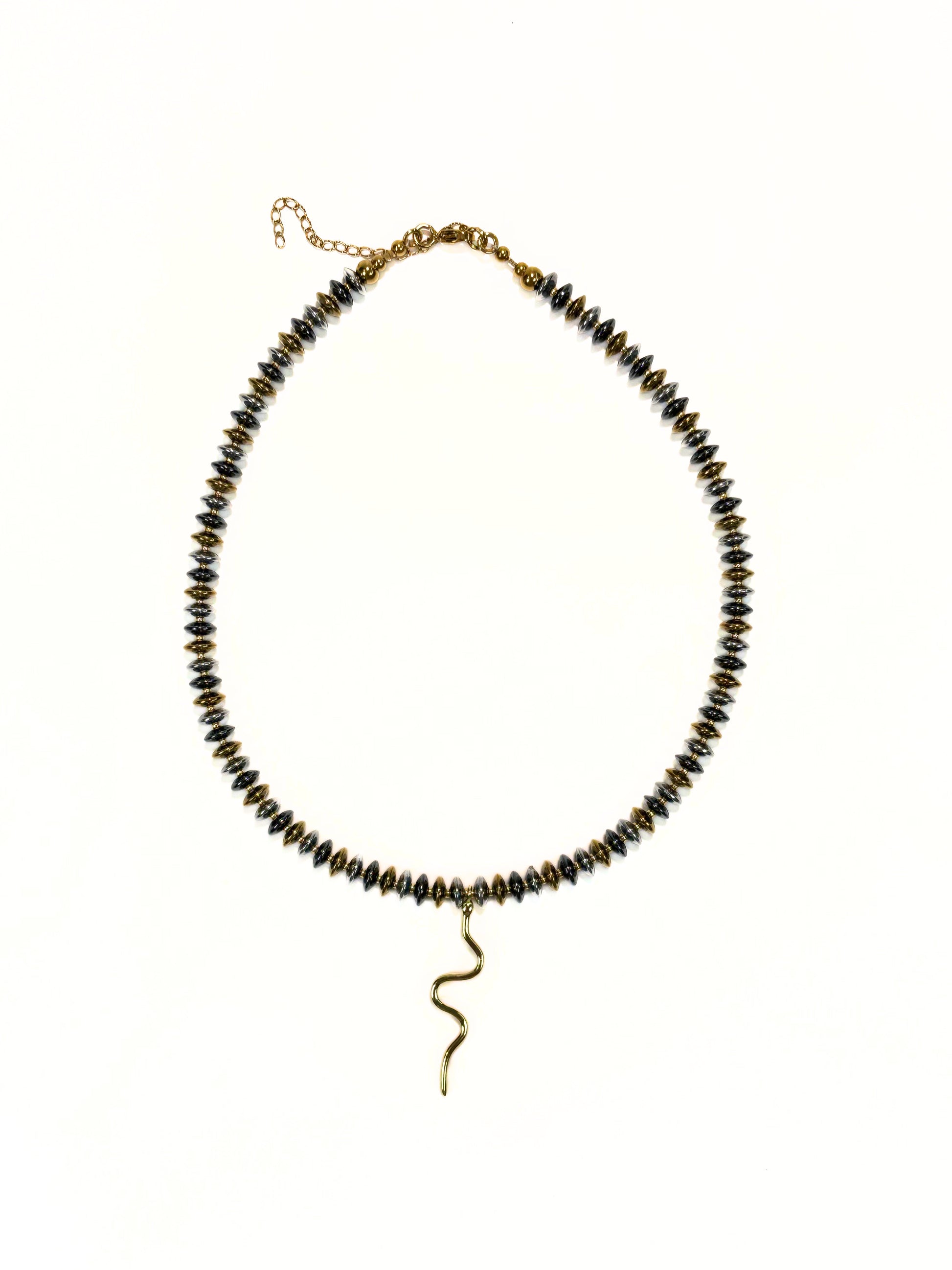 Collar elaborado con cuentas facetadas en tonos negro y dorado metálico, rematado con un dije de serpiente en acabado gold minimalista. Su diseño limpio, moderno y súper estilizado lo convierte en la pieza perfecta para elevar cualquier outfit con un toque edgy y sofisticado.