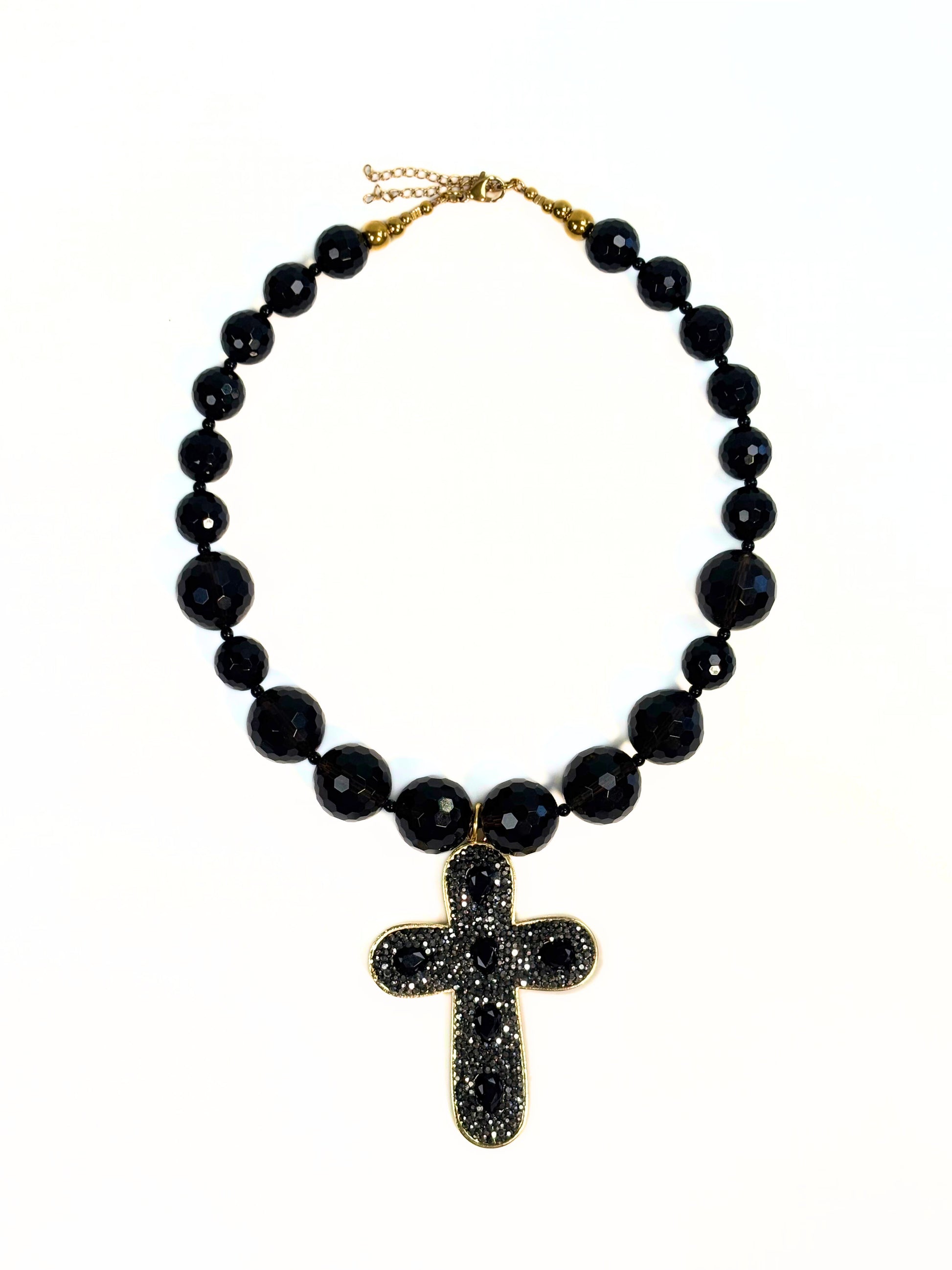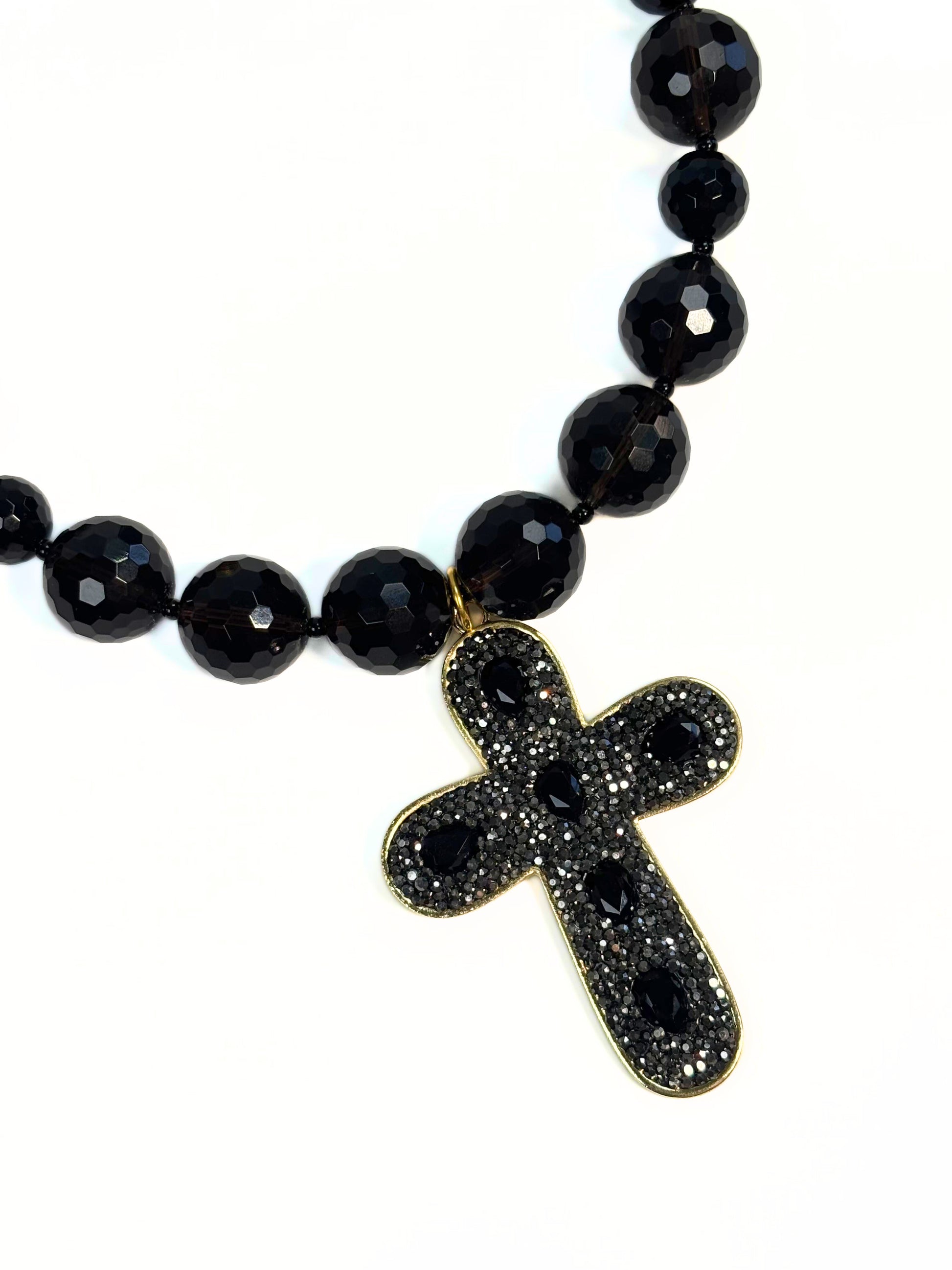 Sus brillos sutiles reflejan la elegancia de la noche, mientras que su cruz central incrustada de cristales simboliza protección, fe y poder interior.